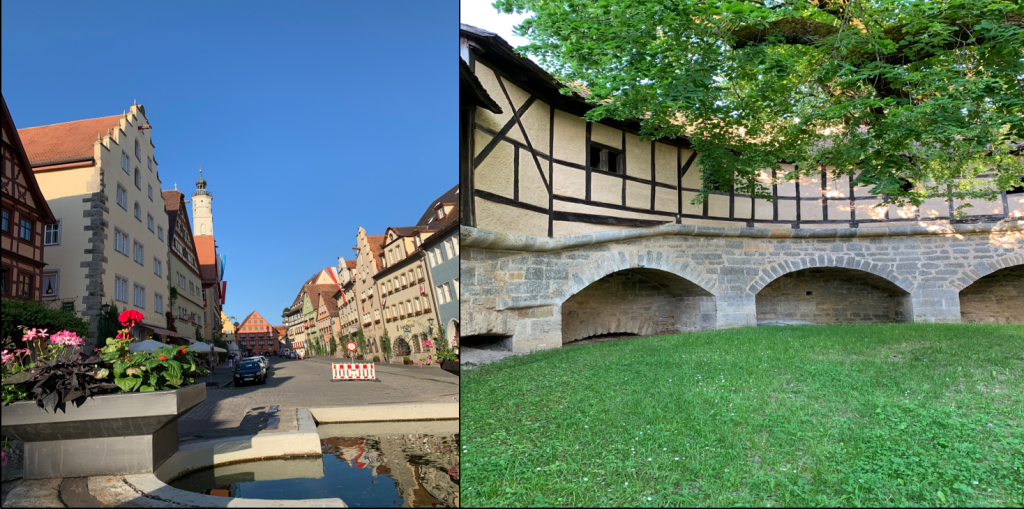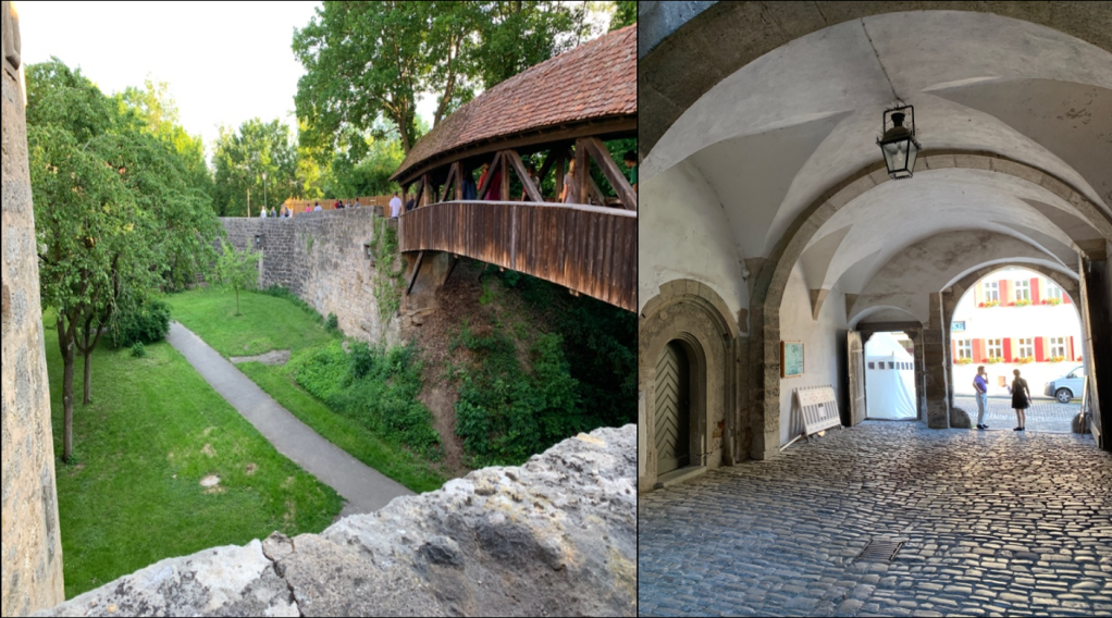 To the left, beautiful Medieval architecture of Rothenburg. To the right, another view of the moat, from the bottom.