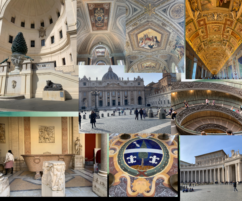 Our lunch consisted of Steak and Shake-style burgers with a Big Mac-style sauce. It was quite tasty. Following lunch, we headed to the Vatican which is a series of museums, residences, and piazzas. Artifacts from around the world reside there. Mosaics, tapestries, statues, and more. The floors are inlaid with intricate marble designs and the walls and ceilings painted with frescos. There were giant marble bathtubs and, of course, the Sistene Chapel and Michelangelo’s famous work.