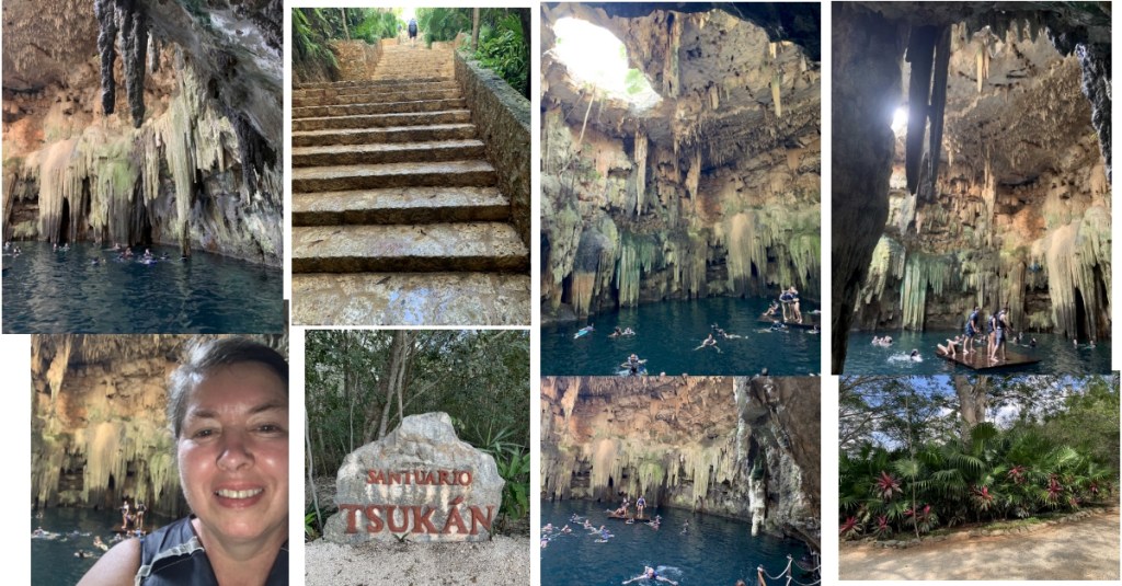 According to our tour director, thousands of underground caves are connected by a vast system of underground rivers. Scientists posit that the asteroid that eliminated the dinosaurs fell off the coast of Yucatán, possibly raising the land from the sea. Because of this, the cenotes formed. The stalactites and stalagmites are similar to those found in aboveground caves, but these are filled with fresh water.